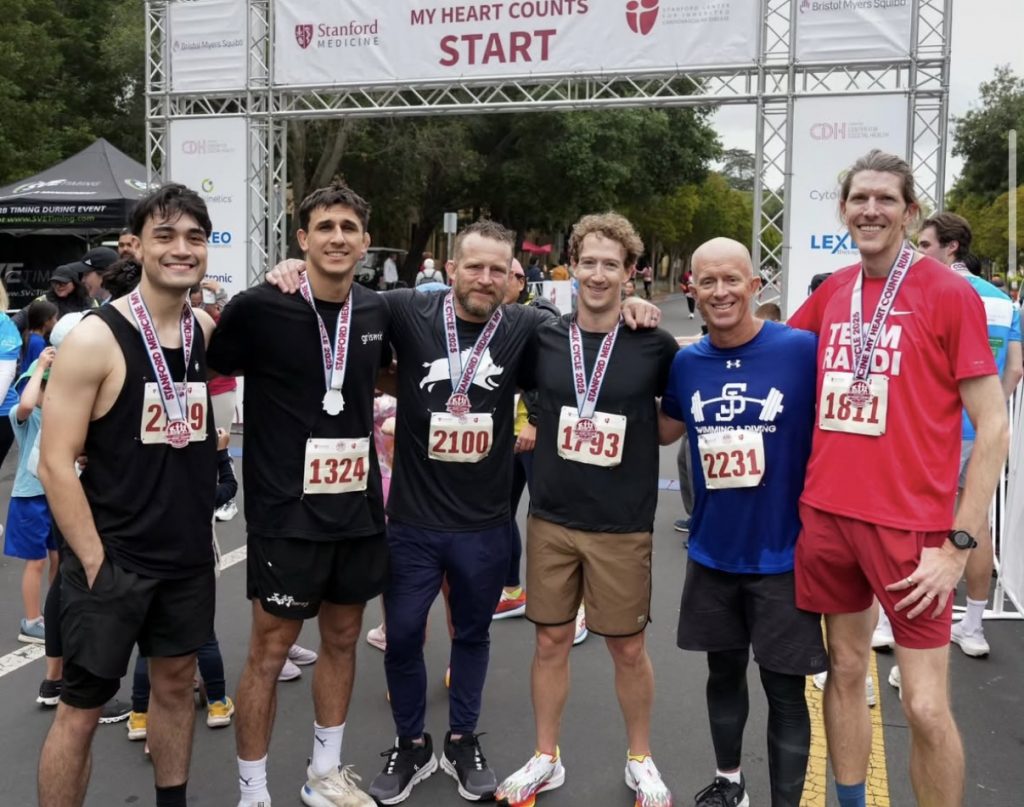 Zuckerberg近年來一直是這個4月跑步活動的支持者,該比賽在史丹福大學校園內舉行,距離 Meta總部只有很短的車程,活動旨在為史丹福遺傳性心血管疾病中心籌集資金。2023 年,Zuckerberg於2023年賽事跑出19 分 34 秒的成績,達到他20分鐘內完賽的目標。2024年,他於接受ACL手術5個月後,再次踏上這起跑線,跑出20 分 58 秒。Zuckerberg一直熱愛跑步,曾經7個月完成365英里,近年他的興趣放於格鬥運動上,包括MMA及巴西柔術等。